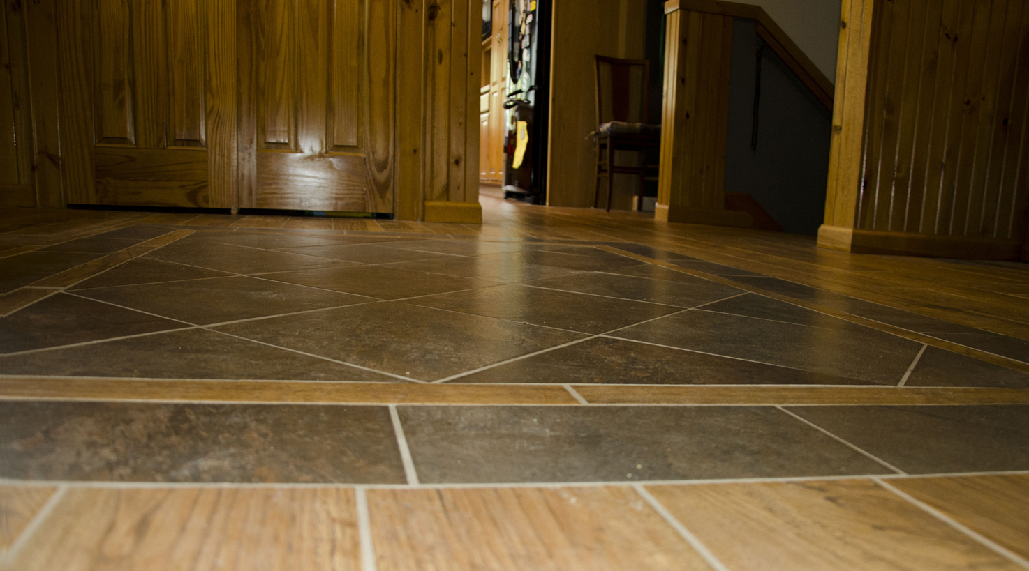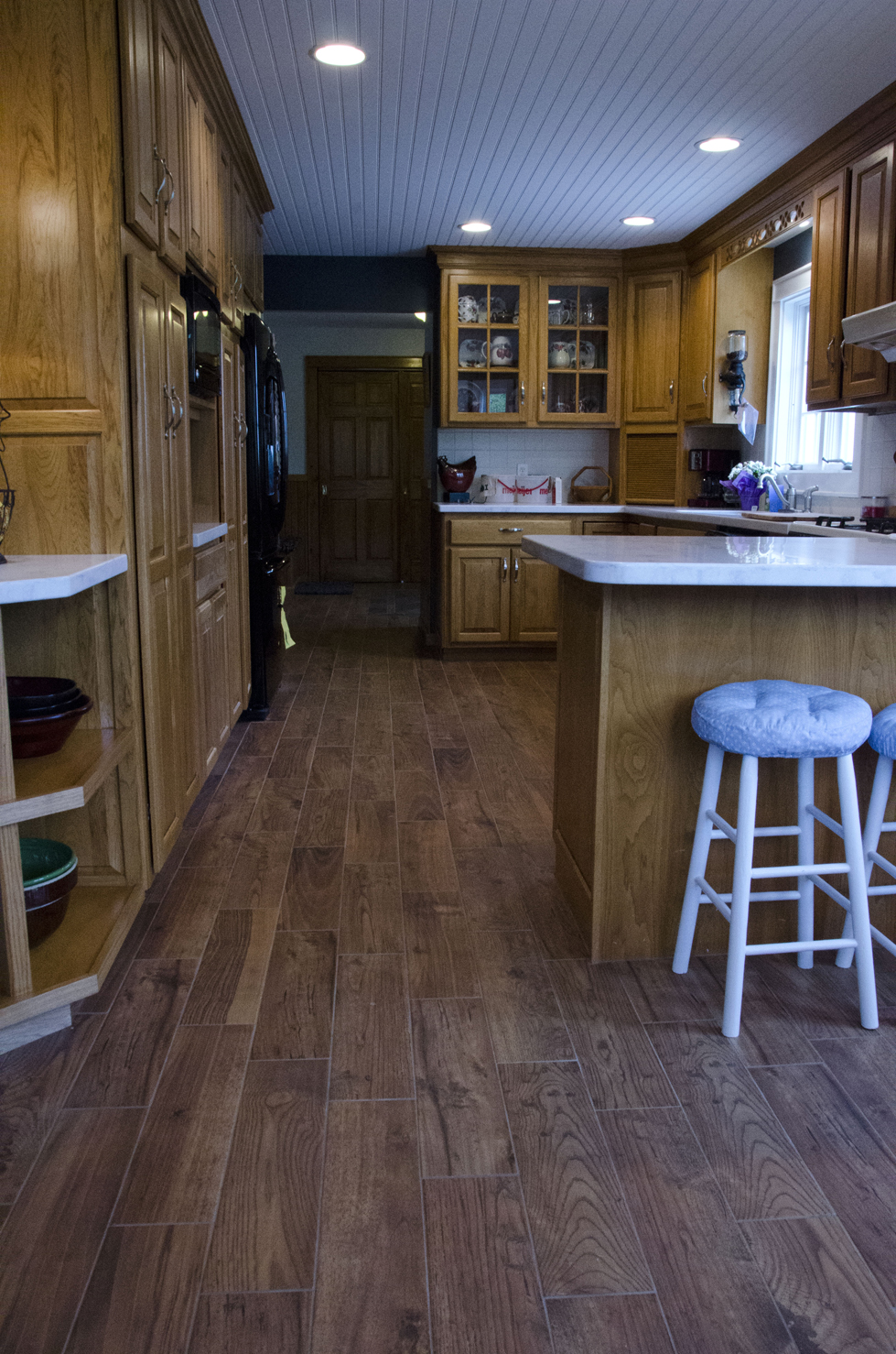The classic look of wood flooring brings just the right touch to this beautifully remodeled country home. The look and warmth of wood but the durability of porcelain tile was just what this busy family needed. Beginning in the foyer, with a custom designed inlay to accent the front entrance, these beautiful 6 x 24 tiles are carried through the hall, kitchen, and dining area.