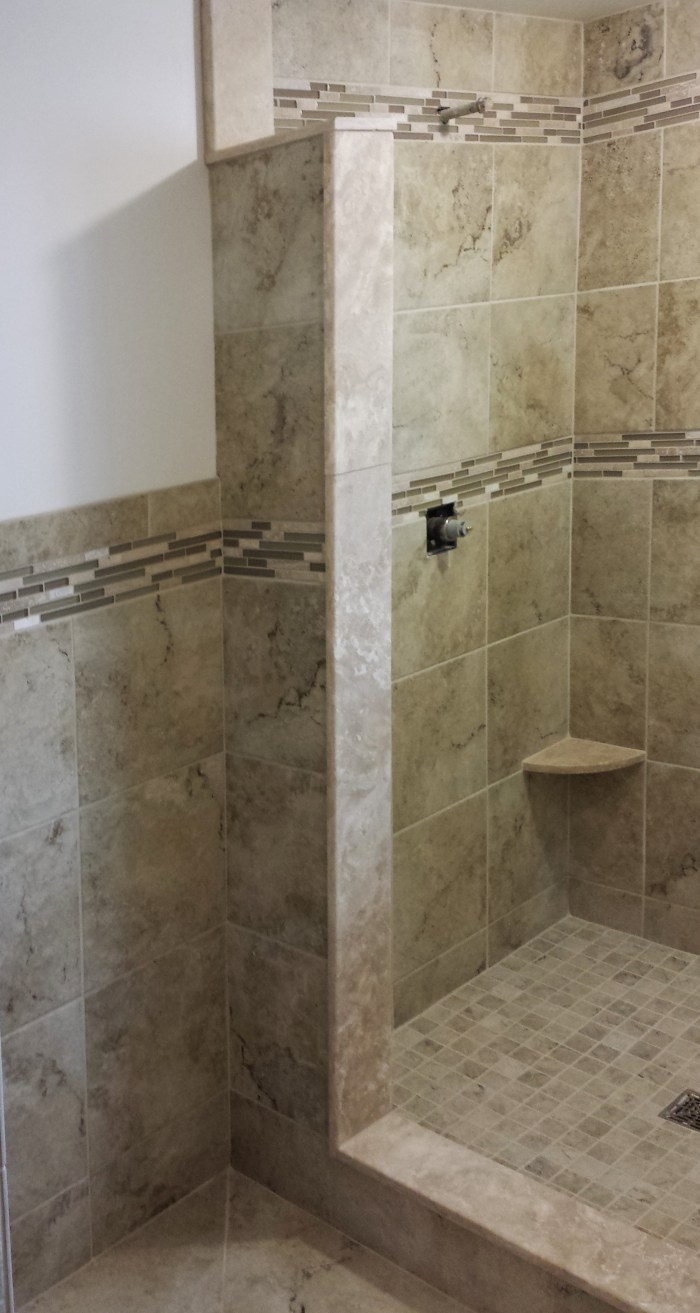 This shower stall features beautiful 12 x 12 tile and two levels of classy deco, along with a custom shave step and corner shelves. The deco travels through the entire room on the walls and behind the sink as a back splash. This shower was part of a multi-room remodel that included tiled floors, hallways, 2 bathrooms, a bedroom, laundry room, and kitchen in Custer, Michigan.